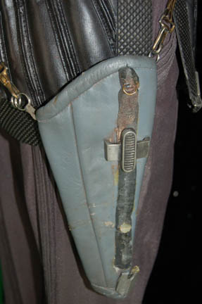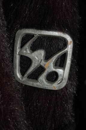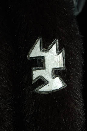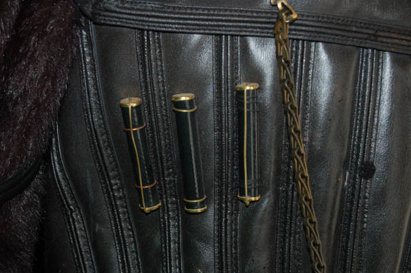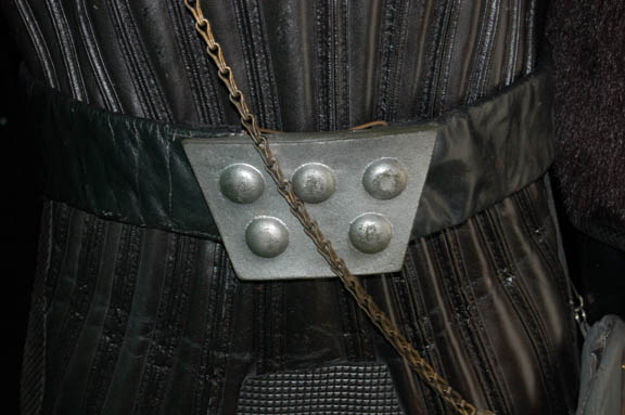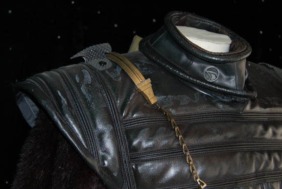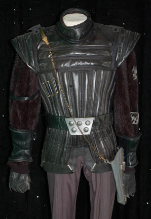 Description: A feature style Klingon warrior costume comprised of a black leather jacket with leather piecework details, insignia, and synthetic fur sleeves; black leather gorget with Klingon language characters; spine piece; gray spandex pants with pleated detail and elastic stirrups and suspenders; belt with buckle, gauntlets and fingerless gloves, shoulder aglet for disruptor holster. The sewn in Deep Space Nine tag is inscribed ‘Chester Tripp'.