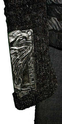 Description: Styled for episodes of Star Trek: Deep Space Nine the uniform of the Romulan Star Empire stands out. The costume comprises an over shirt with elbow length sleeves in the gray and silver fabric in a checkerboard fashion. Attached is a black harness connected to a matching belt that has four emblems of the Romulan Empire, the Imperial Eagle clutching the two planets of Romulus and Remus in its claws; two on the front and another pair on the back. The sleeves under the shirt are made of an elastic material that slip on over the arms and stay in place. The end of one has a Velcro attached resin accessory featuring the Imperial Eagle flying, pictured from the right over Romulan characters, this is the badge of the Tal Shiar, the Romulan secret service. Under the shirt is a turtleneck style collar and shoulder covering that closes behind the neck. The trousers would fit over knee high boots. Inside the shirt and trousers is a Deep Space Nine name tag that reads 'Holiday Freeman'.