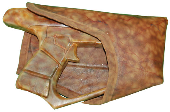 Description: This cast resin Suliban hand pistol with leather holster and fixture for belt attachment was used by the Sulibans during various episodes of 'Star Trek: Enterprise' including "Shockwave, Part II". It has been spray-painted mottled shades of brown and tan for a finished 'Suliban' effect. Measures approx. 9 x 6 x 1 1/2 inches.
