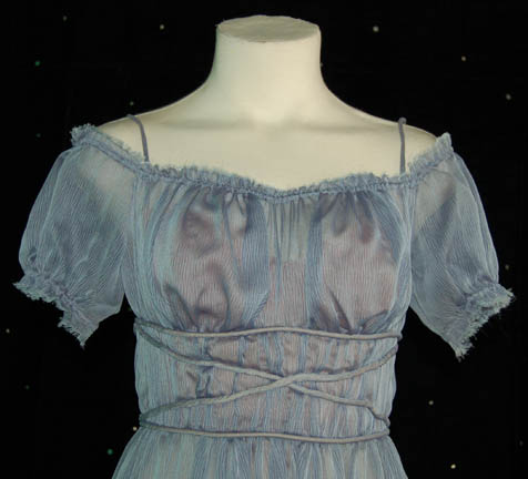 Description: A dress worn by the “Dakalan Wraith” on the dark world during the episode “Rogue Planet” of Star Trek: Enterprise. Hunted by the alien “Eska” the Dakalans escape by shape changing and are capable of finding the innermost thoughts of those who pursue them appearing as whatever they want to see. “Captain Archer” (Scott Bakula) was approached by one who asked for his to help stop her race from being hunted. This light full-length dress is blue and features shoulder straps over a low cut bust. The costumer's tag is inscribed ‘Stephanie Niznik’.