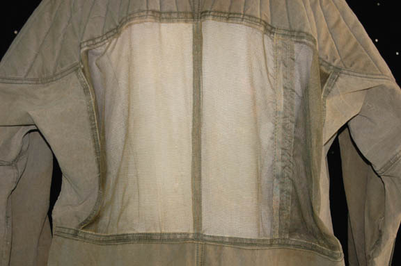 Description: This impressive jumpsuit is made of durable tan material with a matching mesh section in across the lower back and is ‘distressed' in that it is ‘stained’ to appear used. It has Velcro and lace up size adjustments at the cuffs and ankles, zips up the front, and features the ‘Orpheus Mining Colony’ patch on the right breast. Costumes like this were featured in the episode ‘Terra Prime” of Star Trek: Enterprise.