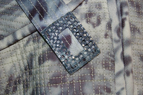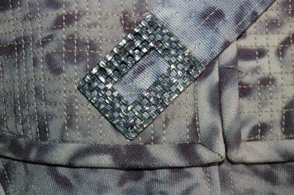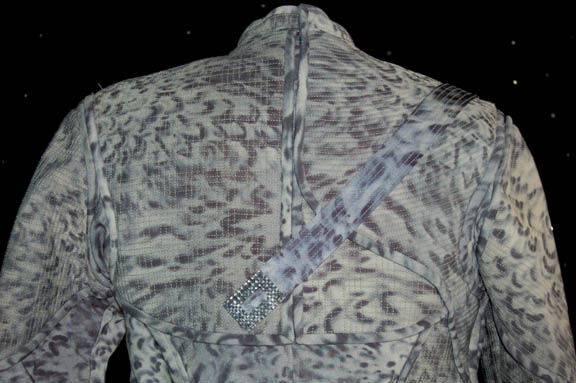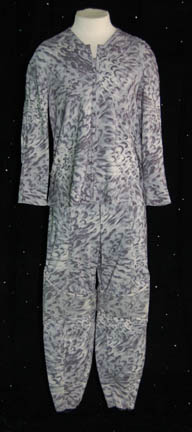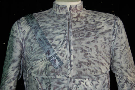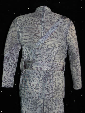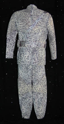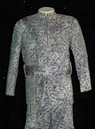 Description: Appearing in the episode “Rogue Planet” of Star Trek: Enterprise this costume is made up of three main components, all based on ‘nighttime' camouflage; pants with black elastic stirrups, a shirt which zips up the back, and a jacket with asymmetrical design in the chest and shoulders. The jacket has loops for an included belt, and features a decorative over the shoulder strap fixed in front, on the back, and on the shoulder, with a rectangular metal badge. The sewn in Enterprise tag reads ‘Keith Szarabajka’ who portrayed “Damrus” in the episode.