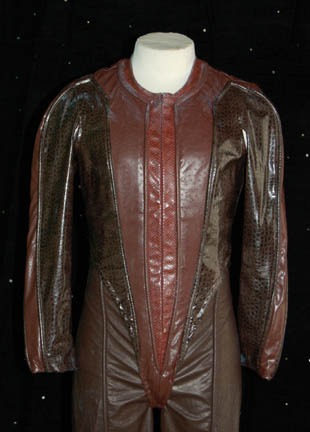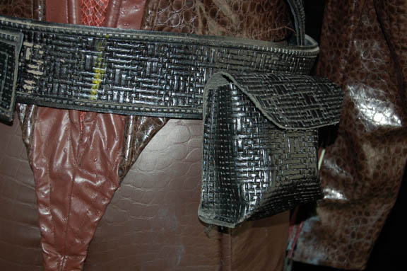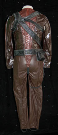 Description: Appearing in the episode “Cease Fire” of Star Trek: Enterprise “Captain Telev” (Christopher Shea) faced off with “Commander Tucker” (Connor Trinneer) from one ship to the other during an incident of high tension between a small Andorian fleet and a Vulcan one of matching firepower. His costume is made up of brown simulated reptile leather pants with black elastic suspenders and stirrups and a matching uniform top with further reptile accents. The costume also features a leather harness that rounds both the shoulders tied across the chest with fastens in the back and a belt and harness that runs over the shoulder and around the waist; it features a black vacuum formed plastic holster and an ammunition pouch/scanner holder that snaps shut. This excellent costume has tags indicating appearances in other episodes featuring Andorian characters.