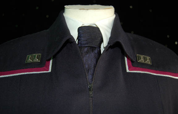 Description: This incredible dark blue zip up blazer is lined, has two pockets, built in shoulder pads, red and silver trim around the shoulders and impressive silver and red cuffs. The cuffs have multiple silver fabrics for definition and detail. The sewn in tags read “Muto Little, Los Angeles” and “Mernoosh Shazadi”. Attached to the left shoulder is the famous ‘Enterprise NX-01' patch and on the right shoulder is the ‘Ad Astra Per Aspera’ patch meaning ‘to the stars through difficulties’. To accompany the blazer is a white long sleeve cotton shirt by ‘Nordstrom Classic’ with buttons up the front and at the cuffs, and dark blue patterned ‘DKNY’ tie. The uniform is complete with dark blue dress pants and suspenders, and comes with two attached metal rank pins indicating the rank of ‘rear admiral’.
