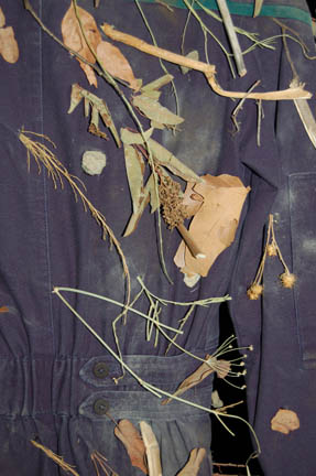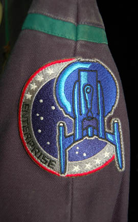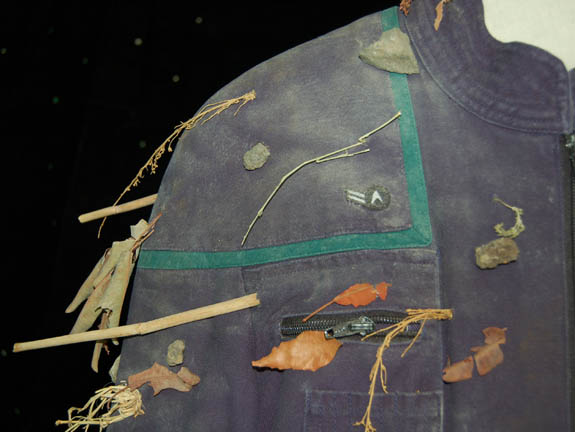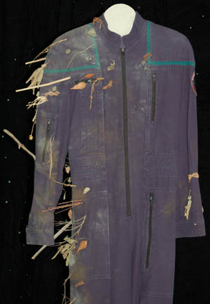 Description: From the episode “Strange New World” of Star Trek: Enterprise this Starfleet uniform jumpsuit was worn by Henri Lubatti in his portrayal of “Crewman Ethan Novokovich”. Having suffered a transporter malfunction during an electrical storm on an alien world he beams back to the ship with plant and ground material blowing through him as he dematerializes, thus arriving on “Enterprise” with the same matter embedded in his skin and uniform. Starfleet uniform jumpsuits include the famous ‘Enterprise NX-01' left shoulder patch. “Enterprise” costumes feature multiple zippered pockets, Velcro size adjustments and zippers at the wrists and ankles, and come with detachable shoulder pads. This one features a black circular rank patch on the right breast with two white stripes indicating the wearer to be the rank of ‘crewman 2nd class’. The uniform shows signs of ‘distress’ in that there are twigs, leaves, and stones affixed to the uniform to indicate the ‘transporter malfunction’. The shoulders feature blue sciences division trim specific to the character. The costume tag indicates wear by ‘Henri Lubatti’.