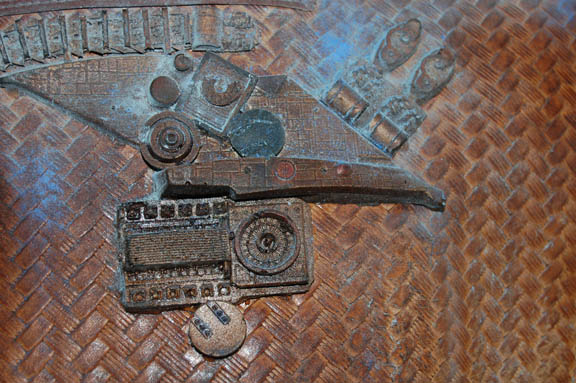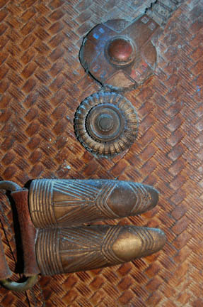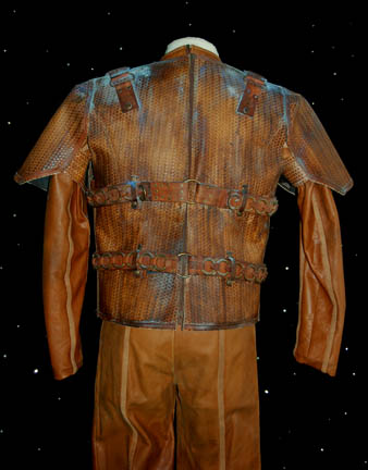 Description: This costume was created for the third season episode "The Xindi" in which Captain Archer and the "Enterprise" crew visit a mine looking for information about the mysterious Xindi who have attacked Earth at the end of season two. The guards in this episode all wear this specific type of costume. It consists of a leather undershirt that zips down the spine and its sleeves protrude out from under a short-sleeved overcoat. The overcoat is made of a foam rubber lining interior while braided patterned leather makes up its exterior; a zipper seals over the spine. There are two belts attached to the front that are leather with metal rings and they attach via Velcro at the spine, the overcoat also features other leather and metal details and blue painted "aging" around them. White elastic suspenders and stirrups hold on the brown leather pants that fit down into excellently detailed boots. The Enterprise tag inside indicates use in the episode.
