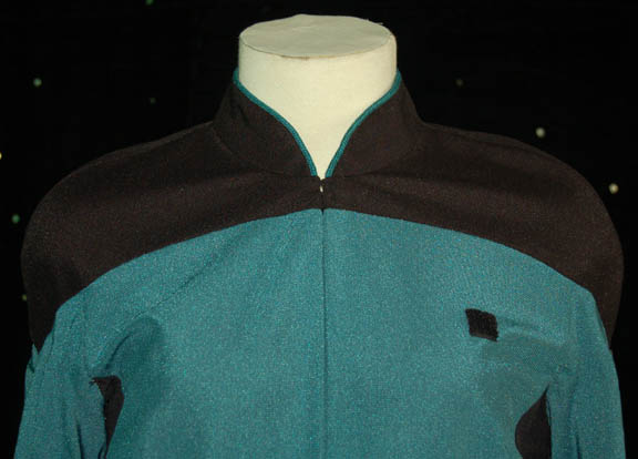 Description: A Starfleet uniform made in the style of Star Trek: The Next Generation featuring the black shoulders with a sciences blue chest and back and black waist and legs that end in stirrups. This style also exhibits the Mandarin collar common to cast members during and after the third season which features blue piping along the top of the collar. This particular uniform has zips that close the front of the costume and features a Velcro patch on the left breast for a combadge (sold separately).