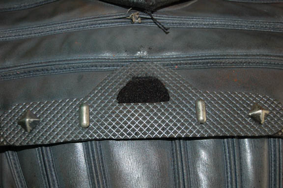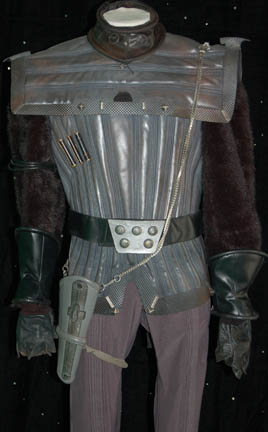 Description: A feature style Klingon warrior costume comprised of a leather jacket with leather piecework details, insignia, and synthetic fur sleeves; leather gorget with Klingon language characters; spine piece; gray spandex pants with pleated detail and elastic stirrups; belt with buckle and ammo box with snap cover, gauntlets and fingerless gloves, shoulder aglet for disruptor holster. Costumes like this were seen in various Star Trek movies (from The Motion Picture through Star Trek VII: Generations) and series (The Next Generation, Deep Space Nine, and Voyager). Interior tags indicate use by multiple actors.