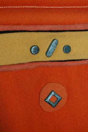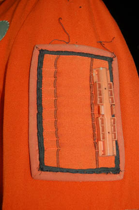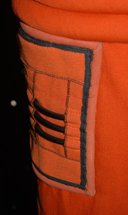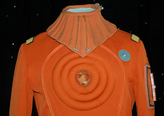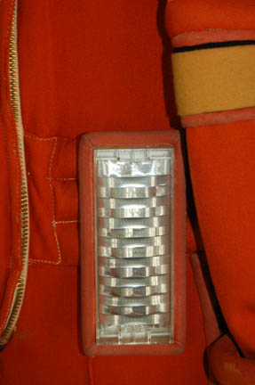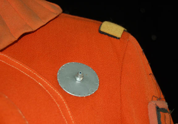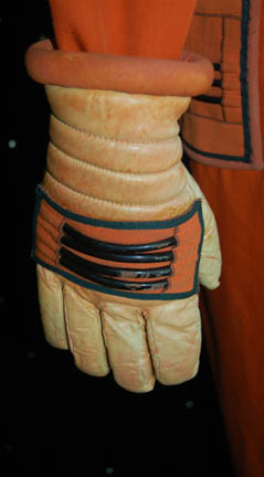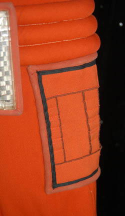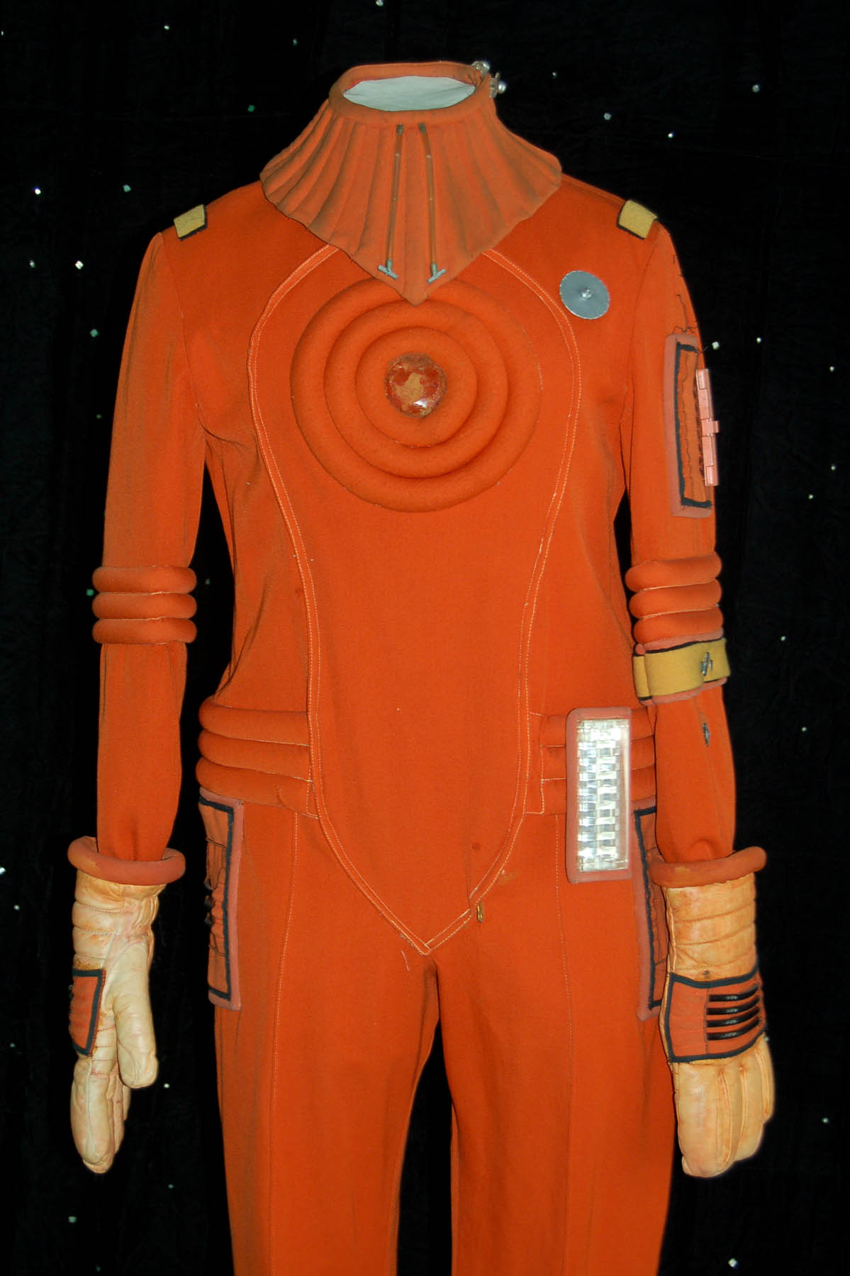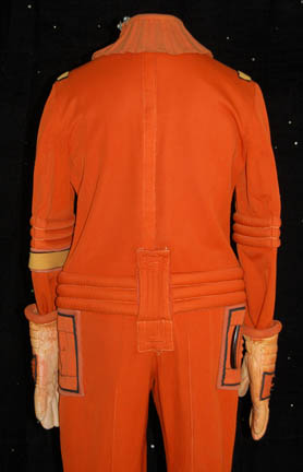 Description: An orange radiation suit made for Star Trek I: The Motion Picture featuring a detachable matching orange gorget with plastic tubing accents, ribbed sleeves and waist, white elastic stirrups at the feet, and the waist, thighs, arms and belt feature sewn in engineering accents. The shoulders feature yellow engineering division stripes, the left forearm features a similarly colored division strip with a meritorious conduct pin and two five year service pins and a rank badge placement indicating the wearer to be an ‘able seaman'. The costume comes complete with orange gloves with accents matching those elsewhere on the costume. The costume seals up the back with Velcro and snaps. The interior tag indicates use by the ever-present Star Trek stunt person ‘Steve Blalock’ while a costumer’s tag is inscribed ‘Greg Barnett, stunt’.