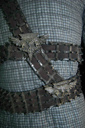 Description: A Romulan uniform featuring a form fitting black jumpsuit with black elastic stirrups at the feet, a zip in the back and clasps at the top. Includes a silver patterned uniform jacket with offset zip on the right breast, and a belt and harness made in the style of Romulan soldiers which wraps around the waist and over both shoulders with a hanging disruptor holster and four wire mounted Romulan Star Empire badges. The interior Deep Space Nine and Voyager tags indicate use by 'Robin Morselli'.