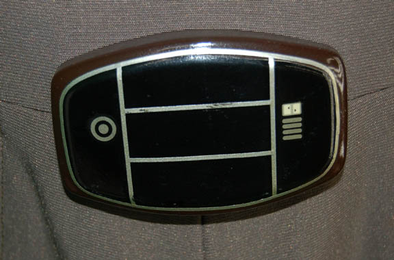 Description: A gray uniform jumpsuit in the style of Star Trek I: The Motion Picture with a costumer's tag inscribed ‘Starbase Personnel’. This full-length costume is long sleeved with elastic cuffs, the ankles feature Velcro size adjustments and clasps with white elastic stirrups, the right thigh features an open top pocket, the waist features a plastic ‘bio-monitor’ with painted accents, and the costume zips up the back with clasps at the neck. The shoulders feature white sewn on command division rank strips indicating rank.