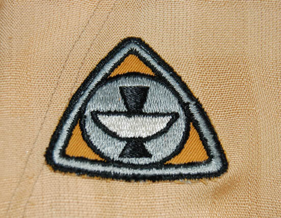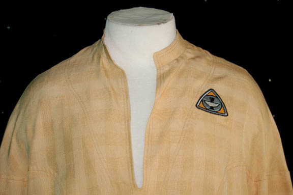 Description: A beige long sleeved shirt with open v-neck and an attached orange ‘Epsilon IX Station' patch on the left breast. An unattached but present ‘Paramont’ tag is inscribed ‘Winnie McCarthy’.