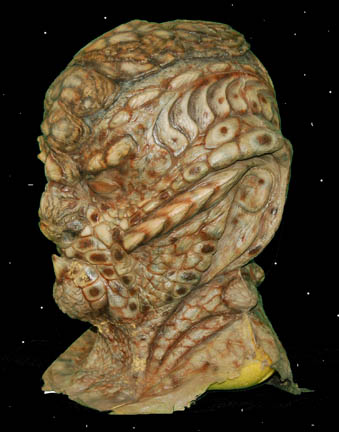 Description: This incredible piece of art is a complete Kolarin head from the Star Trek: Nemesis feature film. Although made of latex, this bust appears not to have been intended for use as a mask since it has been permanently attached to the supporting foam interior that helps it maintain its form. The eyes also have not been cut out, another indication that this was not intended to be an actual mask. That said the detail with which this piece has been made is exceptional. The subtle lines and grooves give the appearance of reptilian skin and the spray painted surface makes the head all the more lifelike. Measures approx. 15 ½ x 10 ½ x 10 ½ inches.