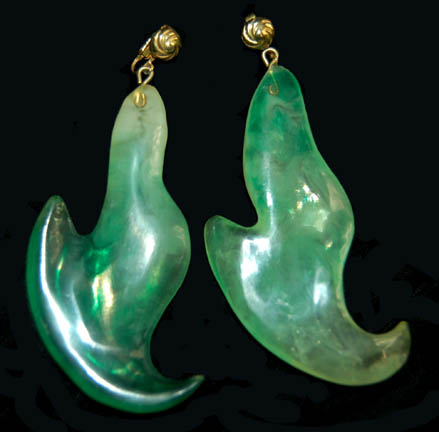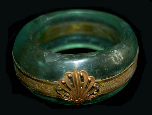 Description: This set of green Star Trek feature film costume jewelry includes an opaque green bangle with a metallic gold colored band around it and an ornate emblem attached. The complimentary clip-on earrings are also opaque green with an internal marbled effect. To complete the set is an opaque yellow ring with three decorative twisted metal bands around it.