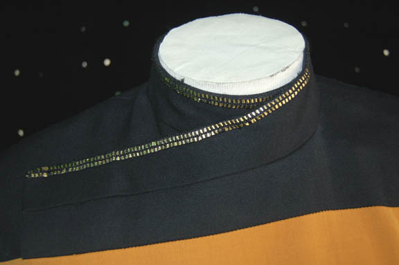 Description: Reserved for special occasions such as weddings, funerals, and diplomatic functions the Starfleet dress uniform has thankfully changed over time. Making its appearance through episodes of Star Trek: The Next Generation the men's uniform was long and went below the waist giving it a dress-like appearance that was oft made fun of, but thankfully the hem line rose over time and gave the costume a dignified appearance on male actors. The costume comes complete with black dress pants, the double breasted uniform top that snaps closed on one side and then zips and clasps on the other, with gold trim along the neck and a Velcro patch for a Starfleet communicator (sold separately). The interior tag reads ‘Tim Russ’ who portrayed “Lt. Cmdr. Tuvok” on various episodes of Star Trek: Voyager.