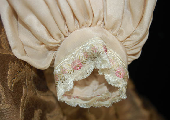 Description: Being trapped in the Delta Quadrant left “Captain Janeway” (Kate Mulgrew) few opportunities to get her crew back home, however, some became available. When “Q” (John De Lancie) appeared on the ship explaining that a war had broken out within the ‘Q Continuum' he took her to a setting that was based on the American Civil War where she was placed in a Civil War era dress. The dress consists of a gold and brown tapestry dress and jacket with black lace frills and brown ball tassels, white buttons, a brown velvet belt with a clasp, and a degree of distress in that there exists a hardly noticeable spattering of special effects blood on the left breast. The interior Voyager tags read ‘Lynn Salvatori’, a stunt woman who also portrayed “Antonia” in Star Trek VII: Generations. The costumer’s tag is inscribed ‘Kate Mulgrew/Lynn Salvatori, #153, distressed’ meaning that the costume was used in the episode “The Q and the Gray”.