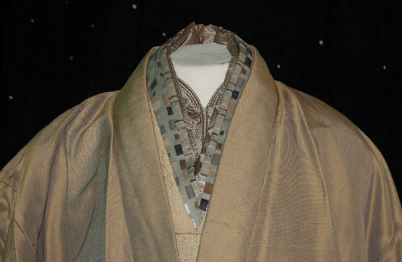 Description: A lot of robes worn in Star Trek X: Nemesis. During opening scenes in which a council session is heard in the Romulan Senate setting the tone for the film, the entire governing body of the Romulan star Empire is assassinated using a theoretical radiological weapon, thus the stage is set for a new praetor to take control of the empire. These senator's robes are made up of a beautiful shiny gold under robe with long sleeves that zip to fit at the cuff, have a slit up the legs, and features interior collars to appear more flush in the same multi-colored square style as the Romulan fleet uniforms from the same movie. The outer robe is made of a subdued gold fabric with a shiny interior lining with elbow length draped arm sleeves, and an open front that has matching tassels sewn on. All of this goes over a matching bib that ties up the back and features a Mandarin style collar. This elaborate piece is made to provoke the most austere appearance in its wearer.