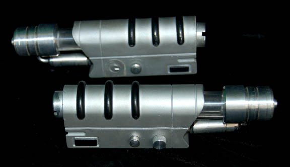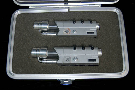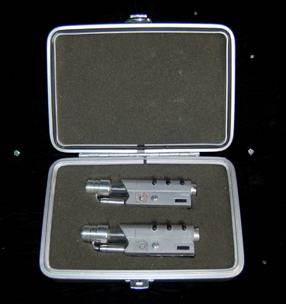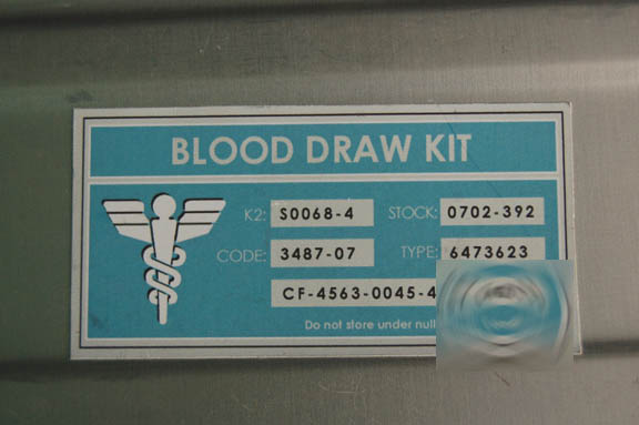 Description: This great prop is from the Star Trek: Enterprise series and belonged to Dr. Phlox's (John Billingsley) sickbay. The case is made of metal with a metal clasp and a Starfleet ‘Blood Draw Kit’ medical sticker on the front. Inside is precision cut foam that holds two faux blood draw hyposprays. Each hypospray is made of cast resin, metal and plastic and has a lever that when pulled reveals a chamber with dried turquoise liquid ‘blood’ inside. A small button on the side keeps the chamber visible until it is pressed in to release it. The case measures approx. 9 x 6 ½ x 2 ½ inches.