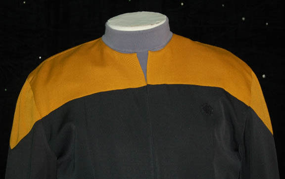 Description: A Vulcan in Starfleet is nothing out of the ordinary in the 24th century, but a Vulcan in the ‘Maquis' is something else altogether. It just turned out not to be so when “Tuvok” (Tim Russ) revealed himself to “Chakotay” (Robert Beltran) as a member of “Captain Janeway’s” (Kate Mulgrew) crew. Having given up his undercover persona, Tuvok returned to active duty on “U.S.S. Voyager” albeit stuck in the Delta Quadrant, but in uniform. His costume consists of a Starfleet uniform jumpsuit, black with operations gold shoulders, clasps for stirrups at the feet, Velcro size adjustments at the wrists, a form fitting elastic waist band with interior nylon belt with clasps, and sewn in loops for ‘away team’ gear, a Velcro patch on the left breast for a Starfleet communicator (sold separately), and a zip up the front of the uniform with clasps at the top. It comes complete with a sleeveless gray turtleneck undershirt that zips up the spine and clasps at the top and fastens between the legs, and detachable shoulder pads. The interior voyager tag reads ‘Tum Russ’.