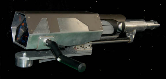 Description: Having responded to a strange signal emanating from the planet ‘Kolarus III' near the Romulan Neutral Zone, “Captain Picard” (Patrick Stewart), “Lt. Cmdr. Data” (Brent Spiner), and “Commander Worf” (Michael Dorn) investigate. Riding the ‘ARGO’, an all terrain vehicle, they collect components of an android strikingly similar to Data, but trouble looms on the horizon as aliens native to planet give chase and Worf returns fire with this exciting prop cannon! Composed mainly of aluminum, this sturdy prop was intended for use on a vehicle mount, much of which is still present. A sliding bracket is fixed onto the cannon as is a rotating turret. The hand grips fold out from the cannon and lock into place, released by a switch for each, the right grip having an affixed thumb button for ‘firing’ the weapon, while the gunner keeps aim on his targets by the ‘screen’ at the end of the gun. The item measures approx. 28.75 X 10.5 inches, while the handles are deployed 29 inches, 11 when not.