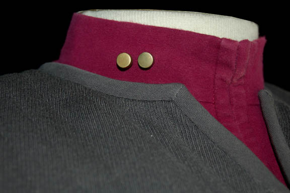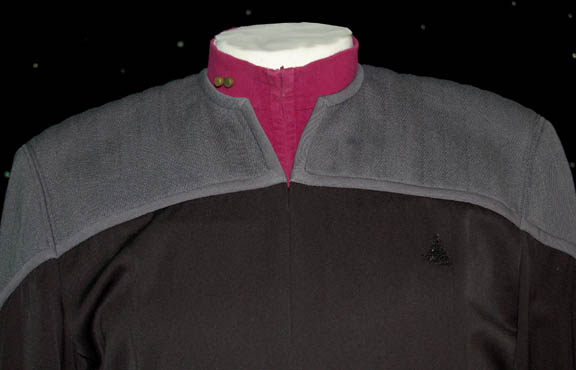Description: As helm officer of the “U.S.S. Enterprise-E”, perhaps the strangest order “Lieutenant Branson” (Michael Owen) ever had to take was “Set a course for Romulus.” He did so without question, but not without a moment's hesitation. His uniform was standard issue for Starfleet officers in the 24th century, a full-length black Starfleet uniform jumpsuit with gray quilted shoulders, operations gold cuffs, form fitting elastic in the waist, black elastic stirrups at the feet, a Velcro patch for a Starfleet combadge (sold separately), and loops for ‘away team’ gear that zips of the center front. It comes complete with an operations gold long sleeved turtleneck undershirt with zips up the center front. The interior ‘MUTO Little, Los Angeles’ tag is inscribed ‘Nemesis’. Unlike many uniforms available, this one also comes complete with the character’s actual rank, two ‘gold’ pip pins with a dual pin backing.