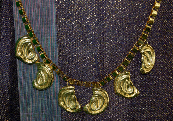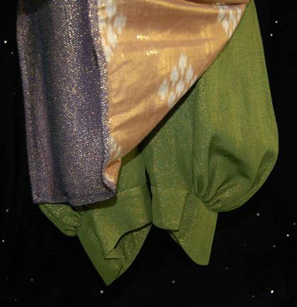 Description: This elaborate costume was worn by Rob LaBelle while portraying “Kafar” in the Star Trek: Voyager episode “False Profits”. A native to the planet upon which a pair of Ferengi assumed the mantle of being the ‘Great Sages' he became their servant, living in relative luxury, thus his costume is as impressive as a Ferengi though made for someone a little taller. A pair of sparkly green parachute pants and a sparkling purple long sleeved shirt that zips and buttons up the right side of the chest and a gold interior lining with a long ‘gold’ necklace featuring six unique ‘Ferengi ear’ jewelry pendants. A costumers tag reads ‘Kafar, Rob LaBelle’.