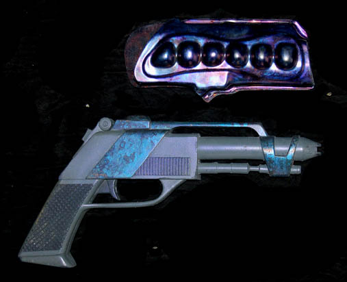 Description: This great prop is a Reman hand pistol used by the Reman military in Star Trek X: Nemesis. Made from solid cast resin and painted metallic purple this imitation pistol comes complete with a removable holster made of vaccum-formed plastic also painted metallic purple. The holster has a metal belt clip on the back. As a bonus, a black fabric carrying pouch is included. Measures approx. 36 x 9 ½ x 2 ½ inches.
