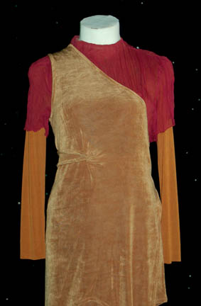 Description: Worn by actress Jennifer Lien in various episodes of Star Trek: Voyager like “State of Flux” this costume is made up of a full-length jumpsuit with an orange blouse and a red one to be worn outside. The orange blouse is worn over the right shoulder and a strap clasps to the front in the middle of the belly. The costumer's tag is inscribed ‘voyager, Jennifer Lien, Kes’.