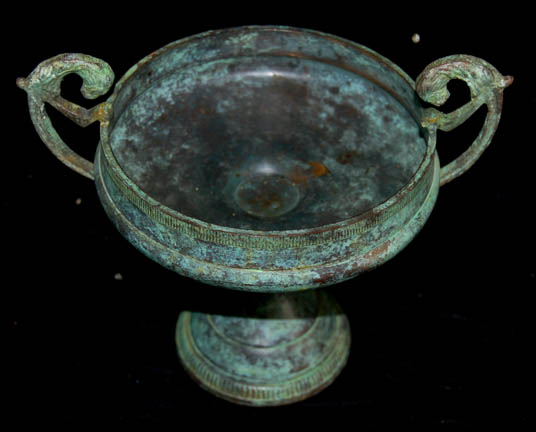 Description: This metal chalice was used as set dressing during the filming of Star Trek episodic television. The ornate handles are animalistic in style and the entire piece appears to have had green paint applied to its surface to give an aged patina finish. Measures approx. 7 x 8 ½ x 6 inches.