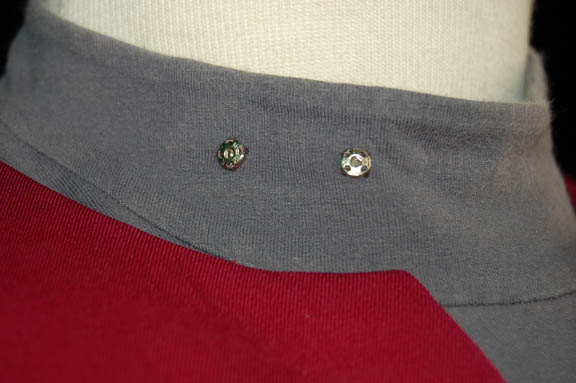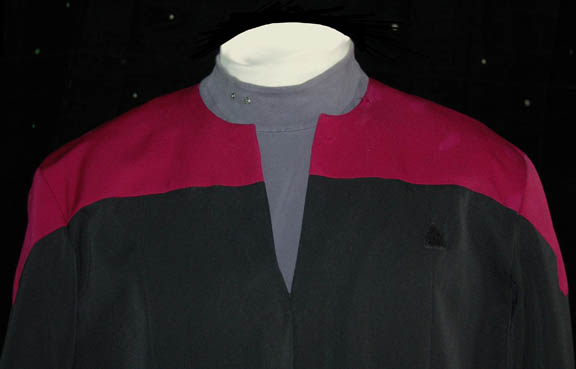 Description: Having left Starfleet when he felt it necessary to defend his people, “Chakotay” (Robert Beltran) became a leader among the militant separatist group, ‘The Maquis'. While fighting the ‘Cardassians’ for his people’s freedom his ship was tossed into the Delta Quadrant, later to be joined by “U.S.S. Voyager”and “Captain JAneway” (Kate Mulgrew) who had been searching for Chakotay’s ship. Trapped 75,000 light years from Federation space Chakotay gave up his ship to aid Voyager in an escape from dangerous aliens and returned to a position of authority aboard the Federation ship. Back in Starfleet uniform again he became first officer of the ship and used his unique position to solidify the two crews, Maquis and Starfleet, on their journey back to Earth. This costume worn by Robert Beltran during his portrayal of Chakotay is a full length Starfleet uniform jumpsuit, black with command red shoulders, a form fitting elastic waistband, black elastic stirrups at the feet, Velcro size adjustments at the wrists, a Velcro patch on the left breast for a Starfleet combadge (sold separately), and a zip up the center of the chest. It comes complete with a gray turtleneck long sleeved undershirt with a snap seal strap that zips up the back and features a pair of snaps for the attachment of rank. The interior Voyager tags are inscribed ‘RobertBeltran’.