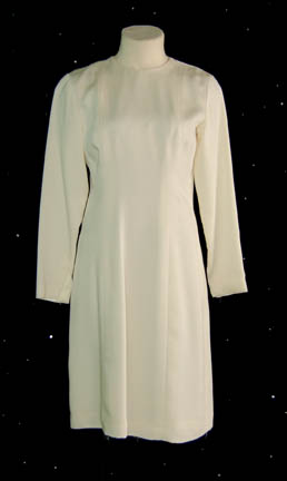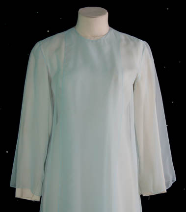 Description: Worn by Rachel Harris while portraying “Martis” in the episode “Before and After” of Star Trek: Voyager. Martis was “Kes'” (Jennifer Lien) mother who, with all the knowledge and understanding she accumulated over the short Ocompa life span, was able to see while reliving her own birth after exposure to a rare form of radiation. Her costume is comprised of a cream colored long-sleeved gown with a zip up the back and matching tights with footies, both worn underneath a light blue, gauzy robe. The costumer’s tag reads ‘Pilot, Rachel Harris, “Martis” Kes’ Mom.’