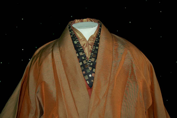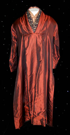 Description: A lot of robes worn in Star Trek X: Nemesis. During opening scenes in which a council session is heard in the Romulan Senate setting the tone for the film, the entire governing body of the Romulan star Empire is assassinated using a theoretical radiological weapon, thus the stage is set for a new praetor to take control of the empire. These senator's robes are made up of a beautiful shiny red under robe with long sleeves that zip to fit at the cuff, have a slit up the legs, and features interior collars to appear more flush in the same multi-colored square style as the Romulan fleet uniforms from the same movie. The outer robe is made of a line texture fabric with a shiny interior lining with elbow length draped arm sleeves, and an open front that has matching tassels sewn on. All of this goes over a matching bib that ties up the back and features a Mandarin style collar. This elaborate piece is made to provoke the most austere appearance in its wearer.