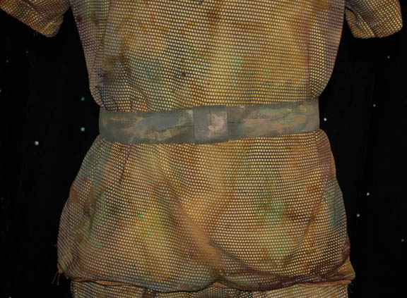 Description: A three costume lot from the episode “Nemesis” of Star Trek: Voyager wherein “Lt. Cmdr. Chakotay” (Robert Beltran) was kidnapped by an alien race, brainwashed into being a soldier in their war, and eventually rescued by “Tuvok” (Tim Russ). The lot consists of three costumes in various states of repair, some designed to be distressed. One of the uniforms sports a ‘shoulder wound', another features general rips and tears due to ‘combat conditions’, the last is the ‘#1’ costume made to appear newest. All three are designed to appear capable for use in a tropical environment utilizing a mesh camouflage, the pants have matching belt loops and black elastic stirrups, they feature Velcro sealing pockets with five gear loops on both legs, the uniform top is short sleeved and the set comes with a camo painted olive drab belt with clasps. The three costumes feature costumer’s tags reading ‘Robert Beltran’ and sewn in Voyager tags indicating the same.