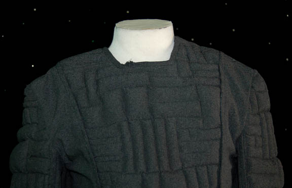 Description: A two piece ‘Khazon' costume from the episode “Alliances” made up of dark gray pants with black elastic stirrups and suspenders, and a quilted uniform jacket that zips up the left side under the arm and features multiple differently sized rectangular shapes sewn in to create a patchwork appearance. The costumer’s tag reads ‘ND Pommar’ and an interior Enterprise tag indicates wear by recurring Star Trek stuntman ‘Louis Ortiz’.