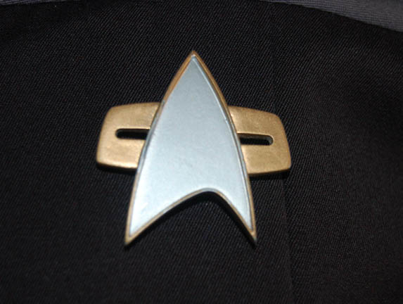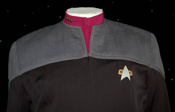 Description: A full length black Starfleet uniform jumpsuit with gray quilted shoulders, command red cuffs, and a matching command red long-sleeved turtleneck undershirt worn by Stephen Cult while portraying “Commander Martin Madden” in a deleted scene from Star Trek X: Nemesis. Upon the unfortunate death of soon to be “U.S.S. Enterprise-E” first officer “Data” (Brent Spiner), “Commander Madden” was assigned to the open position as “Captain Riker” (Jonathan Frakes) had moved on to become captain of the “U.S.S. Titan”. In this scene, “Advice for the New First Officer”, Madden asks Riker how best to make a good first impression on the captain, Riker responds to be informal and call him ‘Jean-Luc'. It doesn’t take long before Madden realizes he has been the target of a joke at his expense. Actor Stephen Culp also played ‘MACO’ “Major J. Hayes” in third season episodes of Star Trek: Enterprise. This uniform comes complete with a rank pin backing and three corresponding pips indicating the rank of ‘commander’ as well as a cast resin Starfleet combadge with applied Velcro backing which affixes to a matching Velcro patch on the uniform itself painted metallic gold and silver. The costumer’s tags indicate use by ‘Stephen Culp’.