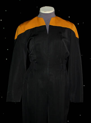 Description: This Starfleet uniform jumpsuit is black with gold operations division shoulders that zips up the front and clasps at the top half way up the chest, and features a Velcro patch on the left breast for a Starfleet ‘combadge' (sold separately). The waist features form fitting black elastic with sewn in loops for ‘away team’ gear, the feet end in black elastic stirrups. Each uniform comes complete with detachable shoulder pads and a gray turtleneck undershirt that zips up the back and clasps at the top.
