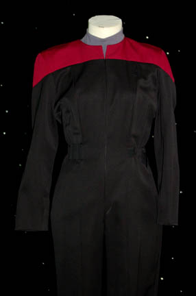 Description: This Starfleet uniform jumpsuit is black with red command division shoulders that zips up the front and clasps at the top half way up the chest, and features a Velcro patch on the left breast for a Starfleet ‘combadge' (sold separately). The waist features form fitting black elastic with sewn in loops for ‘away team’ gear, the feet end in black elastic stirrups. Each uniform comes complete with detachable shoulder pads and a gray turtleneck undershirt that zips up the back and clasps at the top.