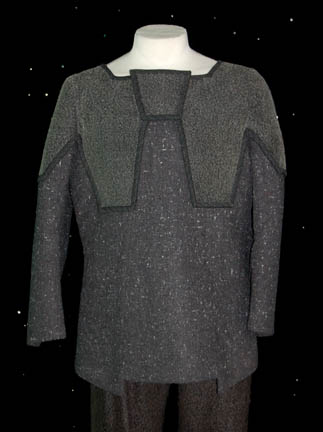 Description: A dark gray two tone costume comprised of pants and a neoprene top worn by Chester Tripp while portraying “Garak” during stunt performances, all befitting “Deep Space Nine's resident ex-spy. Interior Deep Space Nine tags and costumer’s tags indicate wears by ‘Chester Tripp’.