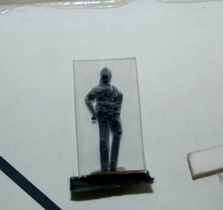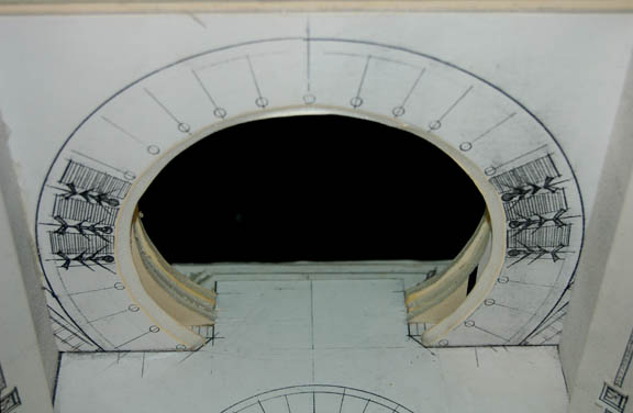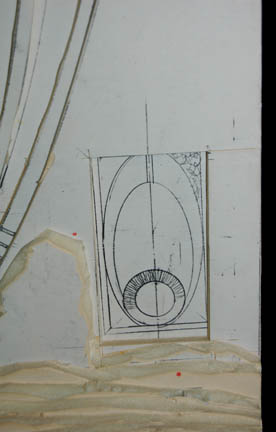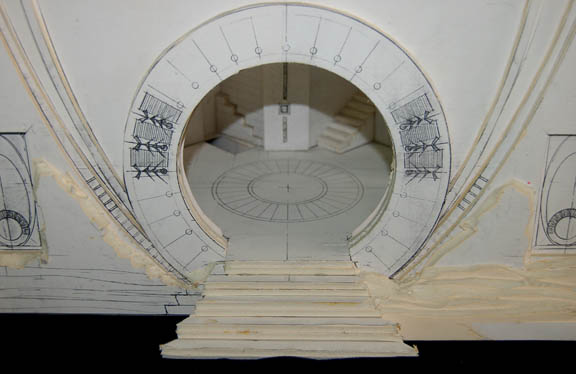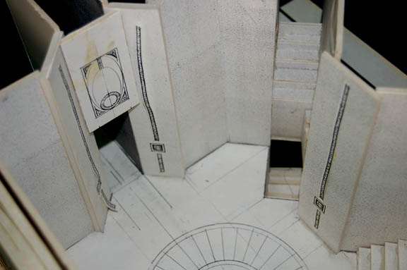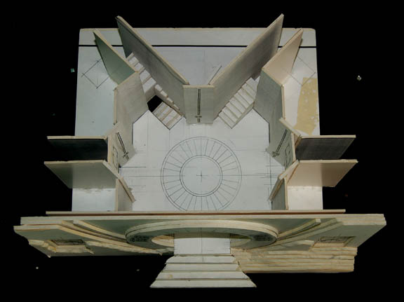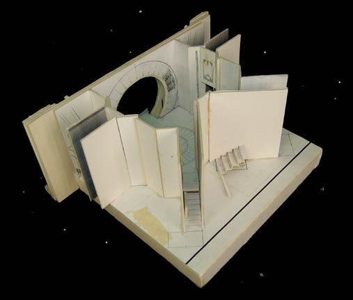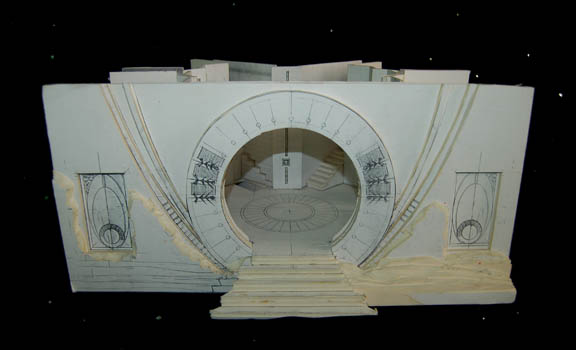 Description: The Bajorans are a humanoid species native to the planet Bajor and were seen throughout the Deep Space Nine series. This is a fabulous Styrofoam (polystyrene) model of a Bajoran temple made by the Star Trek art department and used as a mockup for creating a life size set. The official emblem of the Bajoran people has been incorporated into the design on either side of the central portal as well as inside the model's interior. The Styrofoam layers have been built up to create walls, stairs and steps then black pen has been used for detailed design throughout the model. Measures approx. 20 ¼ x 17 ½ x 9 ½ inches.