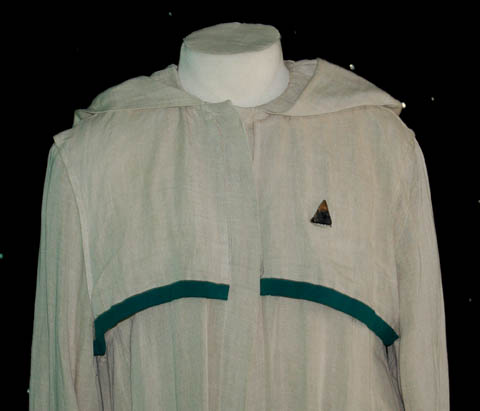 Description: This Desert Starfleet robe and shirt was worn by Todd Slayton who was “Jake Sisko's (Cirroc Lofton) photo double while filming the hot desert scenes during the DS9 episode “Shadows and Symbols”. A photo double is a stand-in for the main actor who holds position while the production crew adjusts lighting and sets up cameras ready for the key actors. The linen robe has a hood, sciences blue trim around the chest and cuffs and a Velcro patch for a combadge (sold separately) to attach. The accompanying shirt is canary yellow with multicolored pin stripes divided into sections by brown strips and a zip up the front. The costume also comes with Reebok shoes that have been modified to appear more suitable for a desert situation. This costume is identical to the one worn by Cirroc Lofton as Jake Sisko.