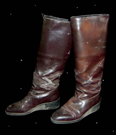 Description: “Jadzia Dax” (Terry Farrell) was a joined Trill who was a Starfleet lieutenant during the Star Trek: Deep Space Nine series. This costume is her civilian wear that consists of a long sleeve puckered maroon top that snaps underneath. It has a plunging neckline, bands around the sleeves and a zip up the front. The accompanying pants are made of the same fabric and have black stirrups at the feet. There is also a belt of the same fabric. The costume is complete with high brown boots that have some distress around the ankles. The inside tags read “Deep Space Nine – Terry Farrell” and costume comes complete with costume tags.