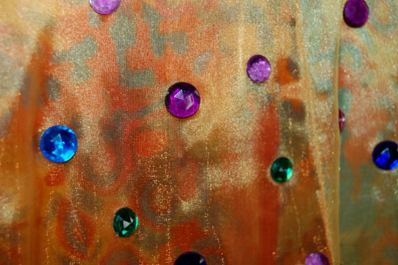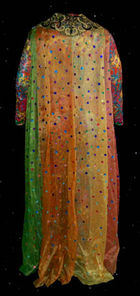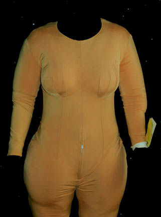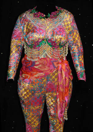 Description: This great costume was worn by Quark (Armin Shimerman) in the memorable Star Trek: DS9 episode “Profit and Lace” where he was required to masquerade as a female “Lumba” in order to prove to the Ferengi commissioners that Ferengi females are intelligent and should be granted the right to wear clothes. The costume includes a padded female bodysuit that zips up the back and has a small zip at the front for bathroom necessities! There are two identical brightly colored psychedelic jumpsuits that were worn over the bodysuit. They both have jeweled flower necklines and chests with strings of beads hanging freely underneath them. There is a sheer multicolored scarf that ties around the waist with gold and faux pearl bead tassels at the ends. Over the jumpsuit is a shear sleeveless robe in bright multi colors with at least a hundred colored plastic jewels glued on. It has an embroidered neckline that plunges down the front and there is a label attached that indicates it needs repair under the arm along the seam. The costume comes with black and yellow high heeled shoes that have sequined flowers and jewels across the toes and clear acrylic heels. To complete the outfit is exotic looking Ferengi lobe jewelry that extends under the chin from one ear to the other. The inside tags on the costume reads “Deep Space Nine, Armin”. Costume comes complete with tags.
