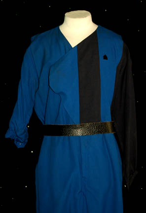Description: A blue and black jumpsuit worn by Avery Brooks while portraying “Commander Sisko” in the episode “Explorers” of Star Trek: Deep Space Nine. Sisko wore this while constructing a Bajoran solar sailing vessel, intent on proving such a vessel was space worthy. The costume features pockets, an elastic waist band, a brown leather belt with Velcro size adjustments, a zipper that stops at a V-neck with snap, and still has topstick for the attachment of a Starfleet combadge (sold separately). The sewn in Deep Space Nine tag indicates use by ‘Avery Brooks'. The belt appears to have been used by various additional actors.