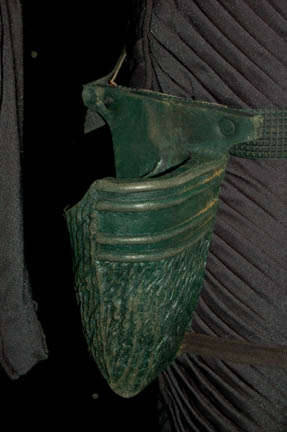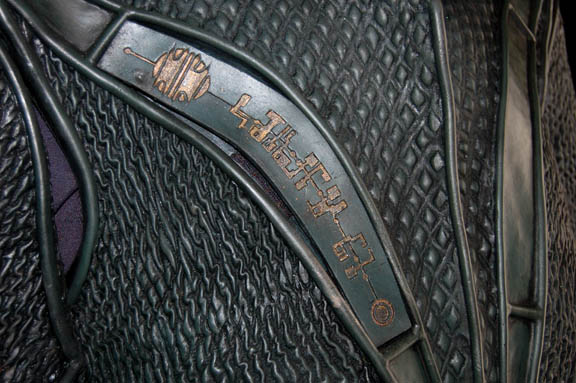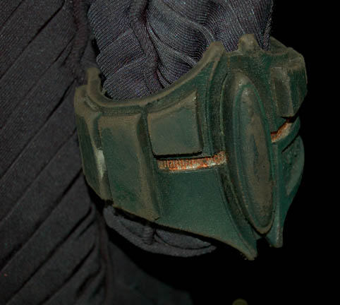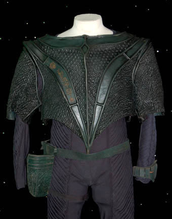 Description: The Cardassian Union relies heavily on its military branch to maintain its government's policies and borders. Through much of the 244th century the military occupied neighboring ‘Bajor’ and its people until they relinquished their claim and left behind station “Terok Nor”. Renamed “Deep Space Nine, when the Federation assumed control at the request of the new Bajoran Provisional Government, the Cardassians maintained a presence throughout the sector and this uniform as much a presence as they were. The costume top is made of cast latex to be worn over a Spandex jumpsuit with stirrups that go inside rubber boots, which include cast latex gaiters. Also included is a cast holster for a Cardassian disruptor pistol on a belt that fastens at the waste and around the thigh, a cast “wrist communicator” that attaches via Velcro, and plastic ‘scale’ armor that attack at the ribs and elbows via snaps. Interior Deep Space Nine tags indicate use by various actors.