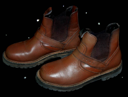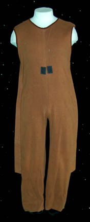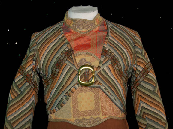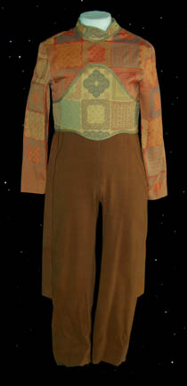 Description: “Rom” (Max Grodénchik) was the younger brother of “Quark” (Armin Shimerman) and the son of “Ishka” (Cecily Adams) during the Deep Space 9 series. Teased his entire childhood because of his smaller than average Ferengi lobes, Rom started his adult career working for poor wages at his brother Quark's bar but managed to work his way up to the superior position of “Grand Nagus” of Ferenginar. This is one of his costumes that includes a brown sleeveless jumpsuit that has dark brown trim around the neck and armholes and a zip up the front. Over the jumpsuit is a cropped top made of patterned earth tone fabric that zips up the back. A cropped jacket made of earth tone fabric in a chevron design completes the look with a gold colored metal buckle at the front. The costume is complete with a matching Ferengi head wrap and brown ankle boots. The inside tags read “Deep Space Nine – Max Grodenchik” and “Voyager – Max Grodenchik”. The costume comes complete with costume tags.