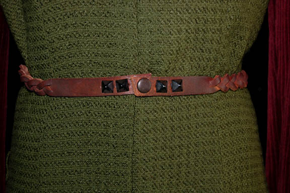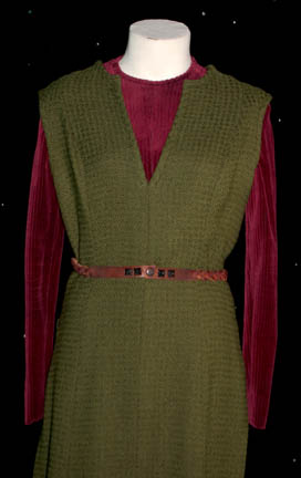 Description: A pair of rust colored cordouroy jumpsuits with two green wool over dresses, a borwn crochet vest, and a brown leather belt, woven with black metal studs that snaps together all worn by Nana Visitor and her stunt double, Denise Roberts, while portraying “Kira” in various episodes of Star Trek: Deep Space Nine. Interior tags indicate wear by ‘Nana Visitor' and ‘Denise Roberts’.