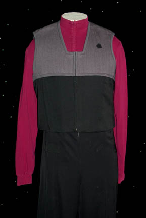 Description: A commando style uniform worn by Avery Brooks while portraying “Captain Sisko” in Star Trek: Deep Space Nine. The uniform consists of black trouser pants with loops for ‘away team' gear, a command red long sleeve turtleneck undershirts that zips up the back, and a black and gray quilted uniform vest that zips up the center and features a Velcro patch for a Starfleet combadge (sold separately). Captain Sisko wore a uniform like this in the episode “In the Pale Moonlight” while iterating to his captain’s log what had recently transpired in his attempt to get the Romulans to join the war effort against the Dominion. All three components of the costume feature sewn in Deep Space Nine tags inscribed ‘Avery Brooks’.