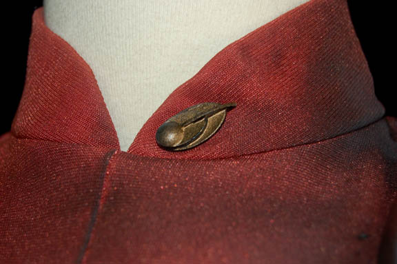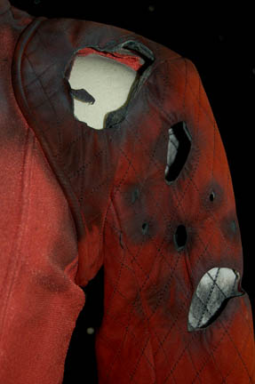 Description: A rust colored Bajoran military uniform with quilted sleeves and shoulders featuring the familiar black diamond thread pattern. From the “Major Kira” collection of costumes, this was worn by stunt actress Denise Roberts during the episode “Defiant” of Star Trek: Deep Space Nine and features an attached ‘major' rank, and a Velcro patch for a Bajoran combadge (sold separately), and clasps for a belt. The left shoulder features a degree of distress in that several holes are present with ‘scorch’ marks around them indicating a burn wound.