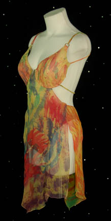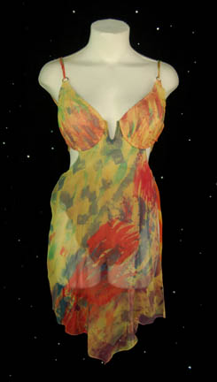 Description: “Jadzia Dax” (Terry Farrell) was a joined Trill who was a Starfleet lieutenant during the Star Trek: Deep Space Nine series. This is her swim costume from the DS9 episode “Way of the Warrior, Part 1”. The body of the suit matches her skin color and has had additional fabric paint brushed over it in shades of brown. Over the top is the visible shear multicolored fabric that flows around the waist. There is a built-in bra and shoe string straps that go around the neck and across the back. The inside tag reads “Deep Space Nine – Terry” and the costume comes complete with costume tag.