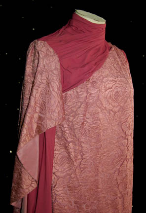 Description: A costume made for the Star Trek: The Next Generation episode “Angel One” in which the “Enterprise-D” crew visits a matriarchal society where the roles of strength in gender are switched, as are the politics. That said, many male characters in the episode wore light, frilly costumes, appearing for more feminine. This pink costume is made up of a jumpsuit with bunched legs near the ankles and cuffs, with an over robe with draping sleeves, complete with a shiny headband. The costumer's tag reads ‘Angel One, Seaso One, TNG’.